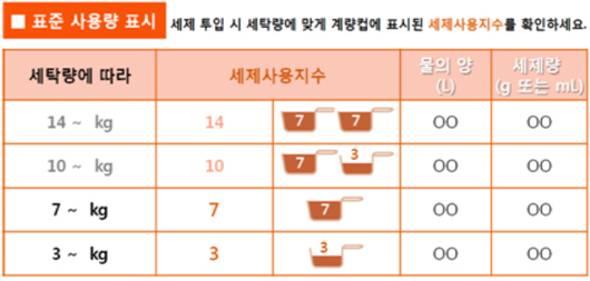 ¡®¼¼Á¦»ç¿ëÁö¼ö¡¯´Â 1ȸ ¼¼Å¹·®(kg)¿¡ ÇÊ¿äÇÑ ÀûÁ¤ ¼¼Á¦ »ç¿ë·®(g ¶Ç´Â mL)À» ³ªÅ¸³»´Â Ç¥ÁØÁö¼ö·Î, ¼ýÀÚ 3°ú 7·Î Ç¥½ÃµÈ´Ù.