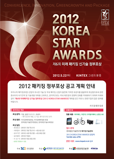 Áö½Ä°æÁ¦ºÎ°¡ ±¹³» ÆÐŰ¡»ê¾÷ÀÇ ¿ì¼öÇÑ ±â¼ú ¹× ±¹³» ÆÐŰ¡ »ê¾÷ÀÇ ¹ßÀü¿¡ ±â¿©ÇÑ À¯°øÀÚ¸¦ ¹ß±¼ÇÏ¿© Æ÷»óÇÔÀ¸·Î½á °ü·Ã Á¾»çÀÚÀÇ »ç±âÁøÀÛ ¹× ±â¼ú°³¹ß ÀÇ¿åÀ» °íÃëÇϰí, ±Ã±ØÀûÀ¸·Î´Â ±¹³» Á¦Á¶¾÷ÀÇ °æÀï·Â °È¸¦ ±Ø´ëÈÇϱâ À§ÇÑ ¡®Á¦6ȸ ¹Ì·¡ÆÐŰ¡ ½Å±â¼ú Á¤ºÎÆ÷»ó(2012 KOREA STAR AWARDS)¡¯À» °ø¸ðÇÑ´Ù°í ¹àÇû´Ù.