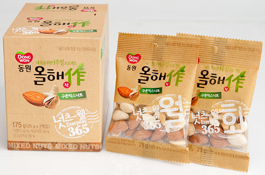 µ¿¿øF&B°¡ ÇÏ·ç ÀûÁ¤·®(25 g)ÀÇ °ß°ú·ù¸¦ ÇÏ·ç ÇÑ ºÀÁö¾¿, ÀÏÁÖÀϰ£ ¸ÔÀ» ¼ö ÀÖµµ·Ï ¸¸µç ¼ÒÆ÷Àå °ß°ú·ù Á¦Ç°, ¡®µ¿¿ø ¿ÃÇØí 1ÁÖÀÏ ÇÁ·ÎÁ§Æ®¡¯ 2Á¾À» Ãâ½ÃÇß´Ù.