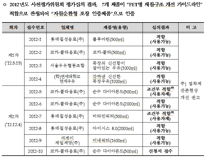 ÀûÇÕÀ¸·Î ½ÉÀÇ ¹× ÀǰáµÈ 7°³ Á¦Ç°Àº (ÁÖ)·Ôµ¥Ä¥¼ºÀ½·áÀÇ ºí·ç¸¶¸° 500ml ¹× ¾ÆÀ̽ýº 8.0 2000ml, (ÁÖ)ÄÚÄ«-Äݶó À½·áÀÇ ÄÚÄ«-Äݶó 500ml ¹× ¼ø¼ö ´ÙÀ̾Ƹóµå 2000ml, ¼¿ï¿ìÀ¯Çùµ¿Á¶ÇÕÀÇ ¸ñÀåÀÇ ½Å¼±ÇÔÀÌ »ì¾ÆÀÖ´Â ¿ìÀ¯ 1000ml, (ÇÐ)¿¬¼¼´ëÇб³ ¿¬¼¼¿ìÀ¯ÀÇ °« Â¥³½ ½Å¼±ÇÑ ¸ñÀå¿ìÀ¯ 1000ml, (ÁÖ)¾¾Á¦ÀÌÁ¦ÀÏÁ¦´çÀÇ ¹Ì³×¿öÅÍ 1600mlÀ̸ç, À̵é Á¦Ç°µµ ¸öü ¹× ¶óº§, ¸¶°³ ¸ðµÎ°¡ ¡°Æ÷ÀåÀç(PETº´) ÀçÁú∙±¸Á¶ °³¼± °¡À̵å¶óÀΡ±ÀÇ ÀûÇÕ(»ç¿ë°¡´É) Ç׸ñ¿¡ ÇØ´çµÇ¾î ÀçȰ¿ëÀÌ ¿ëÀÌÇÑ Æ÷ÀåÀç°¡ Àû¿ëµÈ ¡°ÀÚ¿ø¼øÈ¯Çü Æ÷Àå ÀÎÁõÁ¦Ç°¡±À¸·Î ÀǰáµÇ¾ú´Ù.