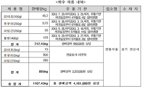 ½ÄǰÀǾàǰ¾ÈÀüó(óÀå Á¤½Â)´Â ¡®ÇÑÁß½Äǰ¡¯(°æ±â ¾È»ê½Ã ¼ÒÀç)ÀÌ ½ÄǰÀÇ À¯Åë±âÇÑÀ» ºÒ¹ýÀ¸·Î ´Ã¸®°Å³ª, Á¦Ç°¸í µî Ç¥½Ã»çÇ×À» ±âÀçÇÏÁö ¾Æ´ÏÇÏ°í ¹«Ç¥½Ã·Î À¯Å롤ÆÇ¸ÅÇÑ °úÀÚ·ù Á¦Ç°µéÀ» ȸ¼ö Á¶Ä¡Çß´Ù°í ¹àÇû´Ù.