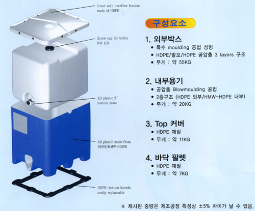 Inner bottle, outer box, top cover, bottom palletÀÌ ¸ðµÎ ºÐÇØ/Á¶¸³ÀÌ °¡´ÉÇÏ¿©, ÆÄ¼Õ ½Ã Ÿ»ç IBCÀÇ °æ¿ì, Àüü IBC¸¦ ±³Ã¼ ÇÏ¿©¾ß Çϳª, ´ç»çÀÇ IBC´Â °¢ ºÎǰº° ±³Ã¼ (º°µµ À¯»ó ÆÇ¸Å)°¡ °¡´ÉÇÏ¿©, ¾ÆÁÖ °æÁ¦ÀûÀÎ Á¦Ç°ÀÌ´Ù.