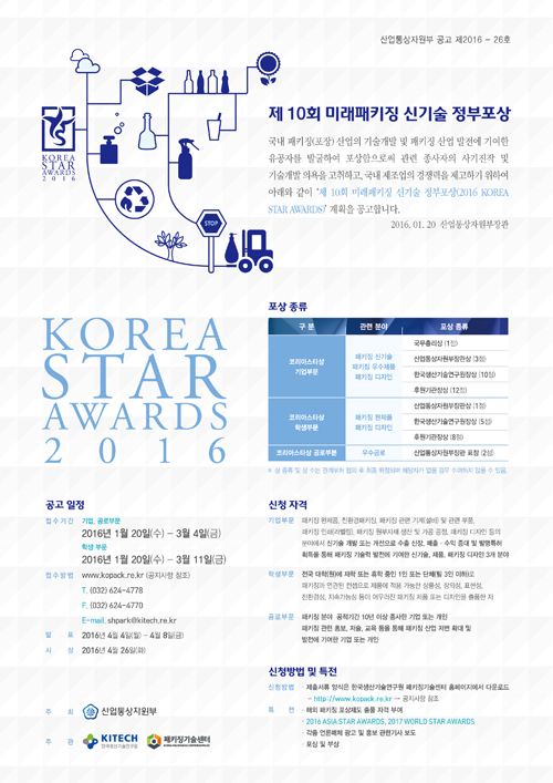 ±¹³» ÆÐŰ¡(Æ÷Àå) »ê¾÷ÀÇ ±â¼ú°³¹ß ¹× ÆÐŰ¡ »ê¾÷ ¹ßÀü¿¡ ±â¿©ÇÑ À¯°øÀÚ¸¦ ¹ß±¼ÇÏ¿© Æ÷»óÇÔÀ¸·Î½á °ü·Ã Á¾»çÀÚÀÇ »ç±âÁøÀÛ ¹× ±â¼ú°³¹ß ÀÇ¿åÀ» °íÃëÇϰí, ±¹³» Á¦Á¶¾÷ÀÇ °æÀï·ÂÀ» Á¦°íÇϱâ À§ÇÑ ¡®Á¦10ȸ ¹Ì·¡ ÆÐŰ¡ ½Å±â¼ú Á¤ºÎÆ÷»ó(2016 KOREA STAR AWARDS)¡¯°èȹÀÌ °ø°íµÆ´Ù.