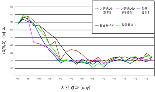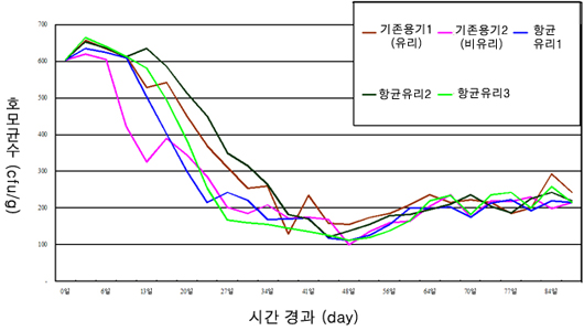 ¿¹ÄÁ´ë ÃÊ»ê±Õ, È¿¸ð±Õ ¹× ÀϹݼ¼±ÕÀ» ÅõÀÔÇÑ »ý¸·°É¸®¸¦ Ç×±Õ¼º À¯¸®¿ë±â ¹× ºñÇ×±Õ¼º À¯¸®¿ë±â(±âŸ ÀçÁúÀÇ Æ÷Àå¿ë±â Æ÷ÇÔ)¿¡ ´ãÀº µÚ »ó¿Â ¹× ³ÃÀå(¾à 7.4¡É)¿¡¼ º¸°üÇÑ ´ÙÀ½ 10ÀÏ, 20ÀÏ ¹× 30ÀÏ °æ°ú ÈÄ ±ÕÀÇ ¼ýÀÚ¸¦ °üÂûÇÑ °á°ú, ÃÊ»ê±Õ°ú È¿¸ð±ÕÀÇ ¹ø½Ä ¼Óµµ°¡ Á¶ÀýµÇ¾î ½Ã°£(º¸°ü)ÀÌ °æ°úµÊ¿¡ µû¶ó ±âÁ¸ ºñÇ×±Õ¼º À¯¸®¿ë±â¿¡ ºñÇØ ±ÕÀÇ »ýÁ¸À²ÀÌ Áõ°¡ÇÑ ¹Ý¸é, ´ëÀå±ÕÀÇ ¼ºÀåÀ» ¾ïÁ¦½ÃŰ´Â È¿°ú°¡ ³ªÅ¸³µ´Ù.